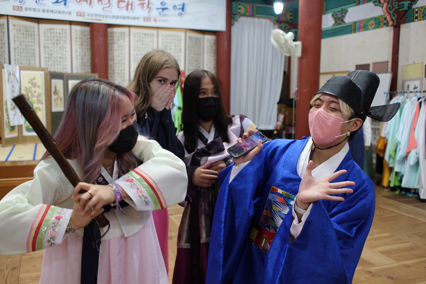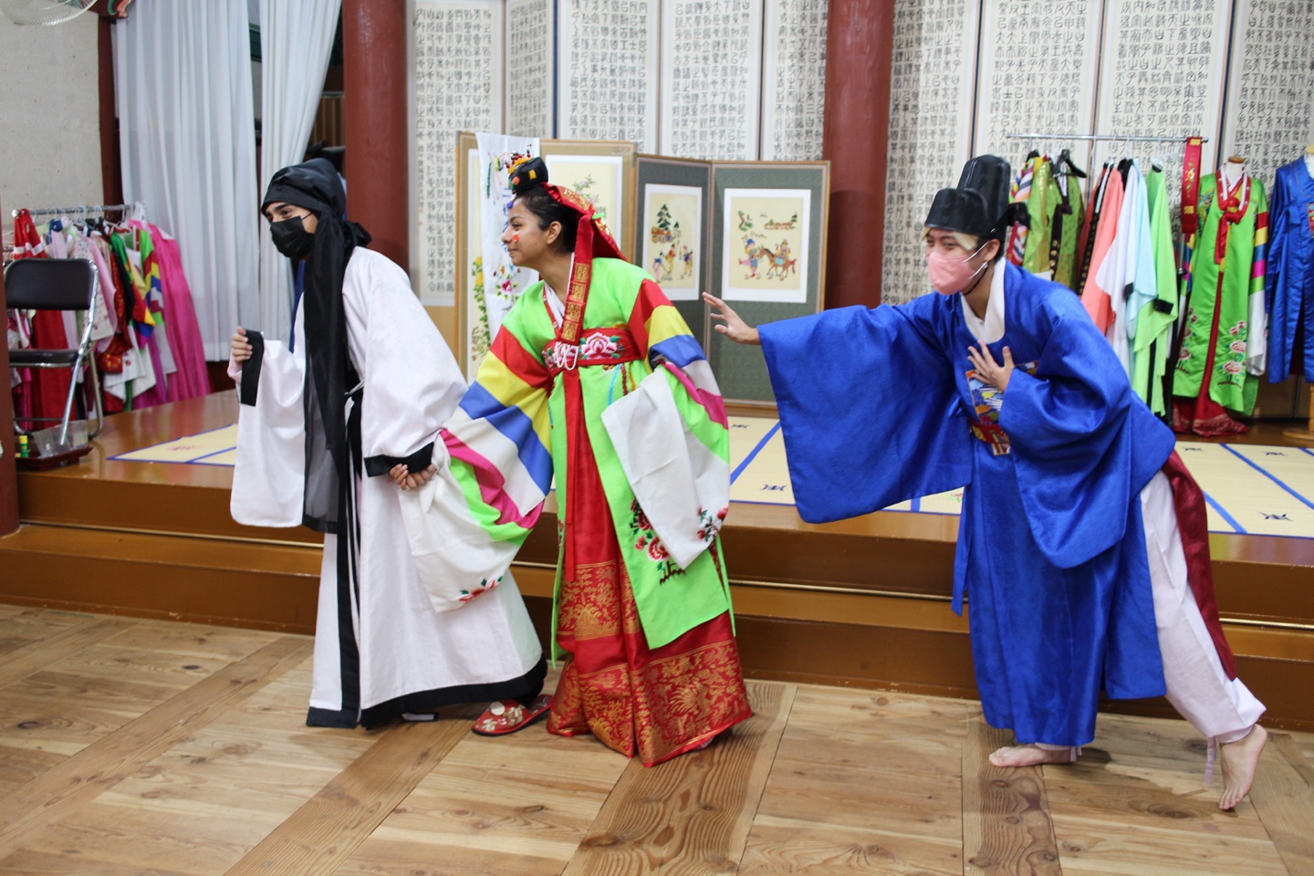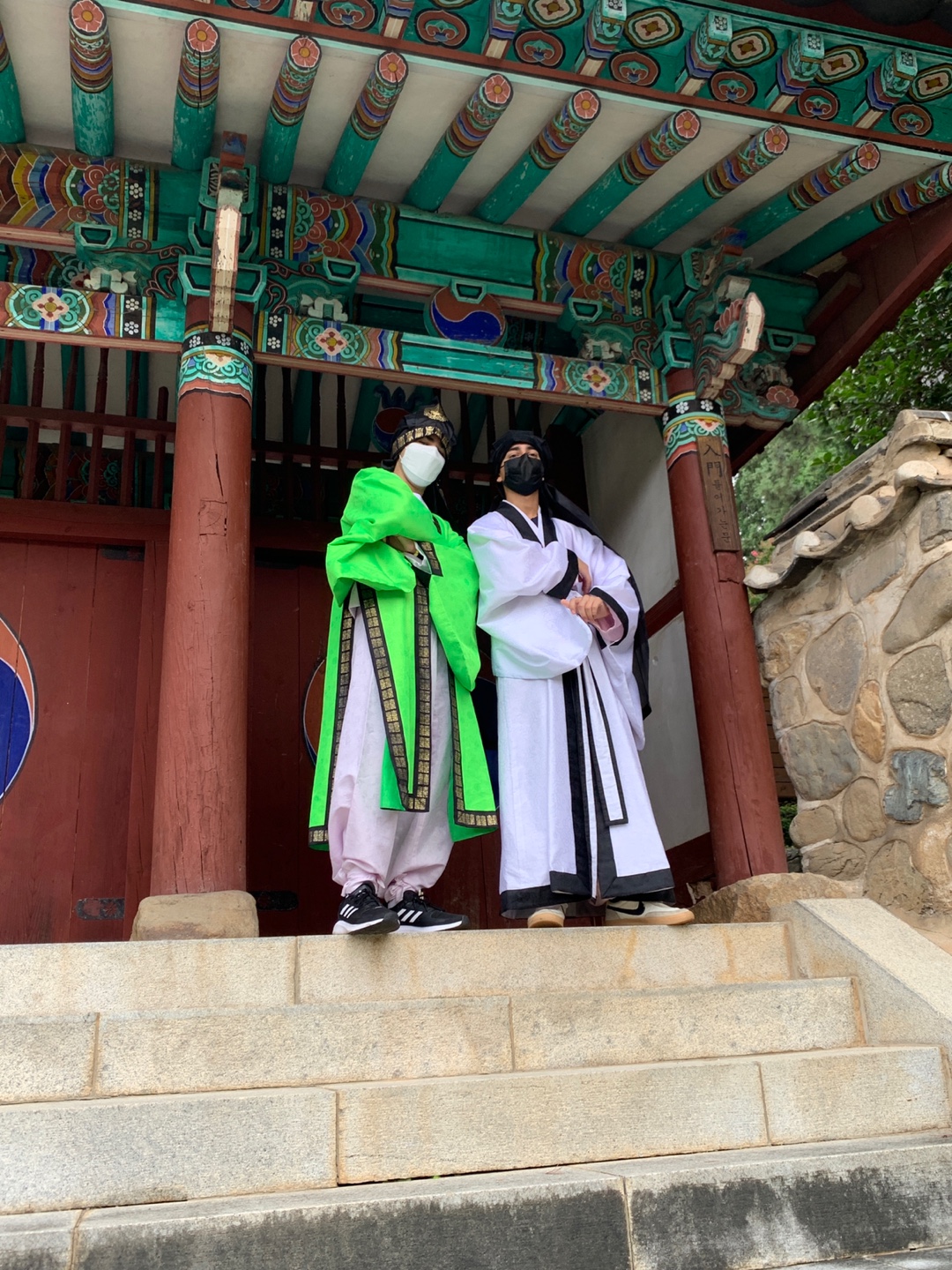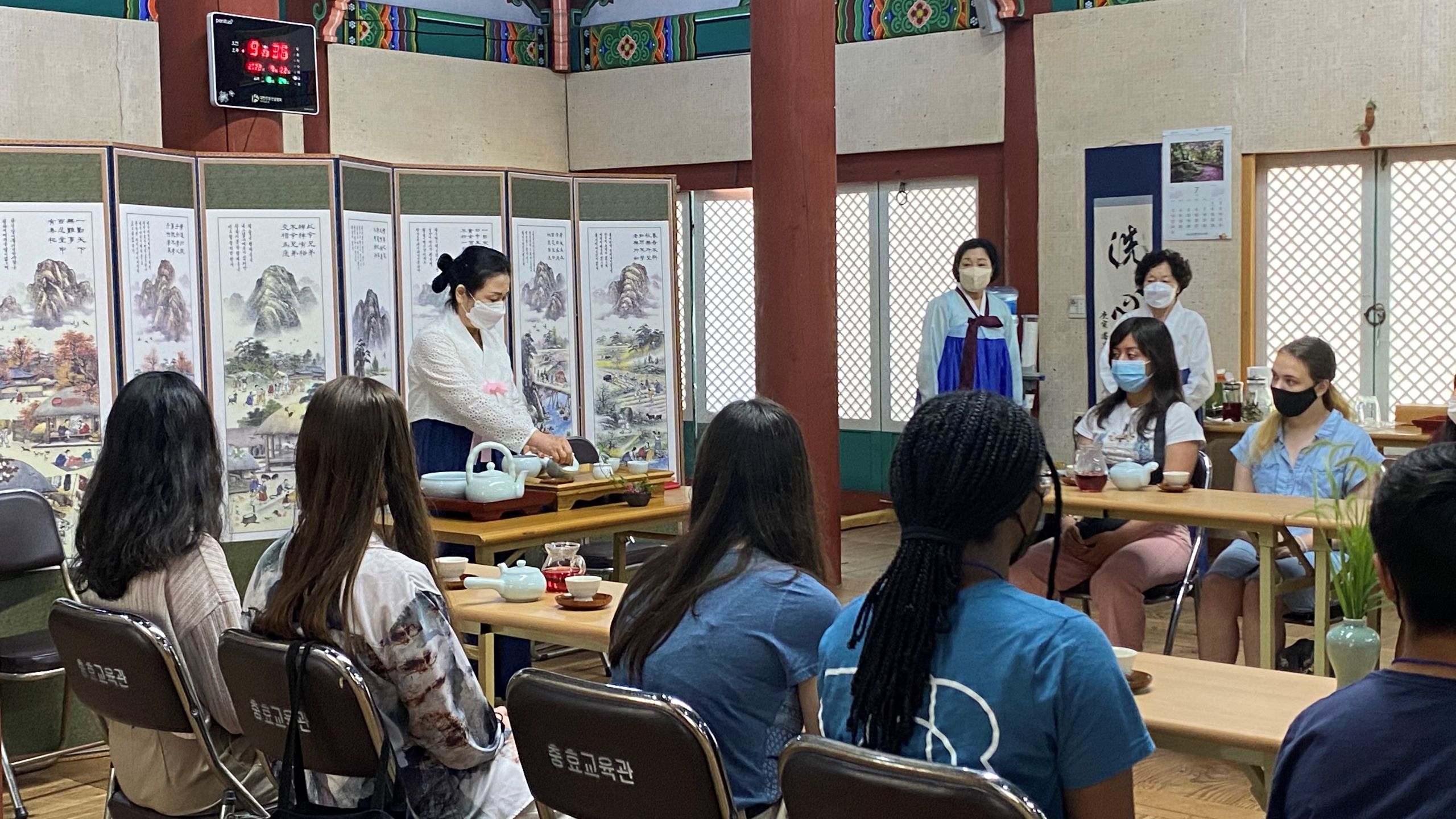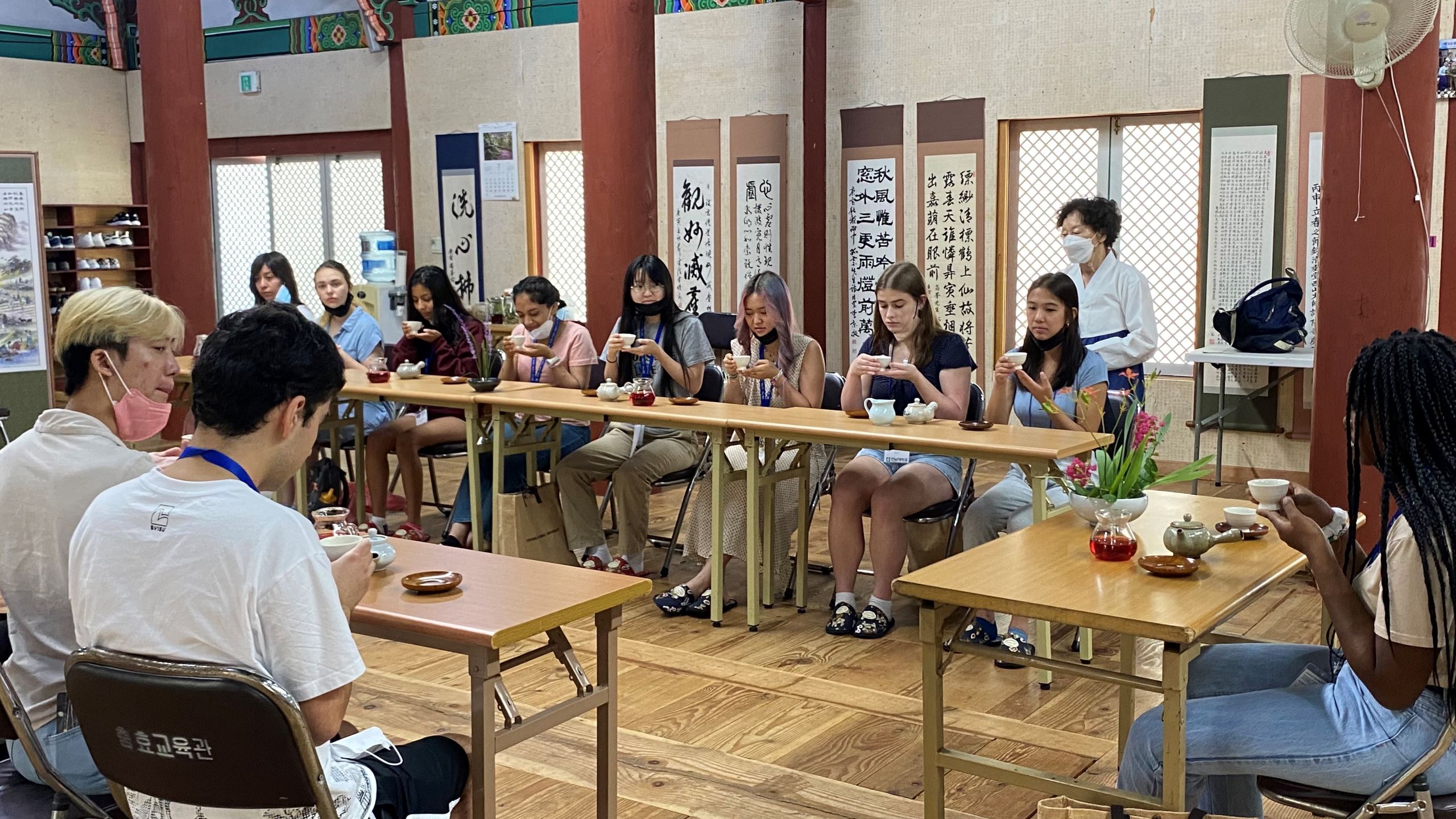 This week for our cultural activity we visited a preserved hyanggyo. Hyanggyos were government run schools established all over Korea during the Joseon Dynasty for the education of the aristocracy. In hyanggyos sons of the noble class prepared for the government examination, studied Confucian thought, and were taught the proper manners of the elite. We learned about the traditional forms of the Korean tea ceremony and had got to taste the prepared tea. Instructors at the hyanggyo taught us the rules for bowing properly, which change depending on the situation. The students were able to try on hanbok, traditional Korean dress, and practice the steps of a traditional Korean wedding ceremony. After we visited the hyanggyo, we went to a Korean restaurant and had bulgogi, Korean grilled meat.