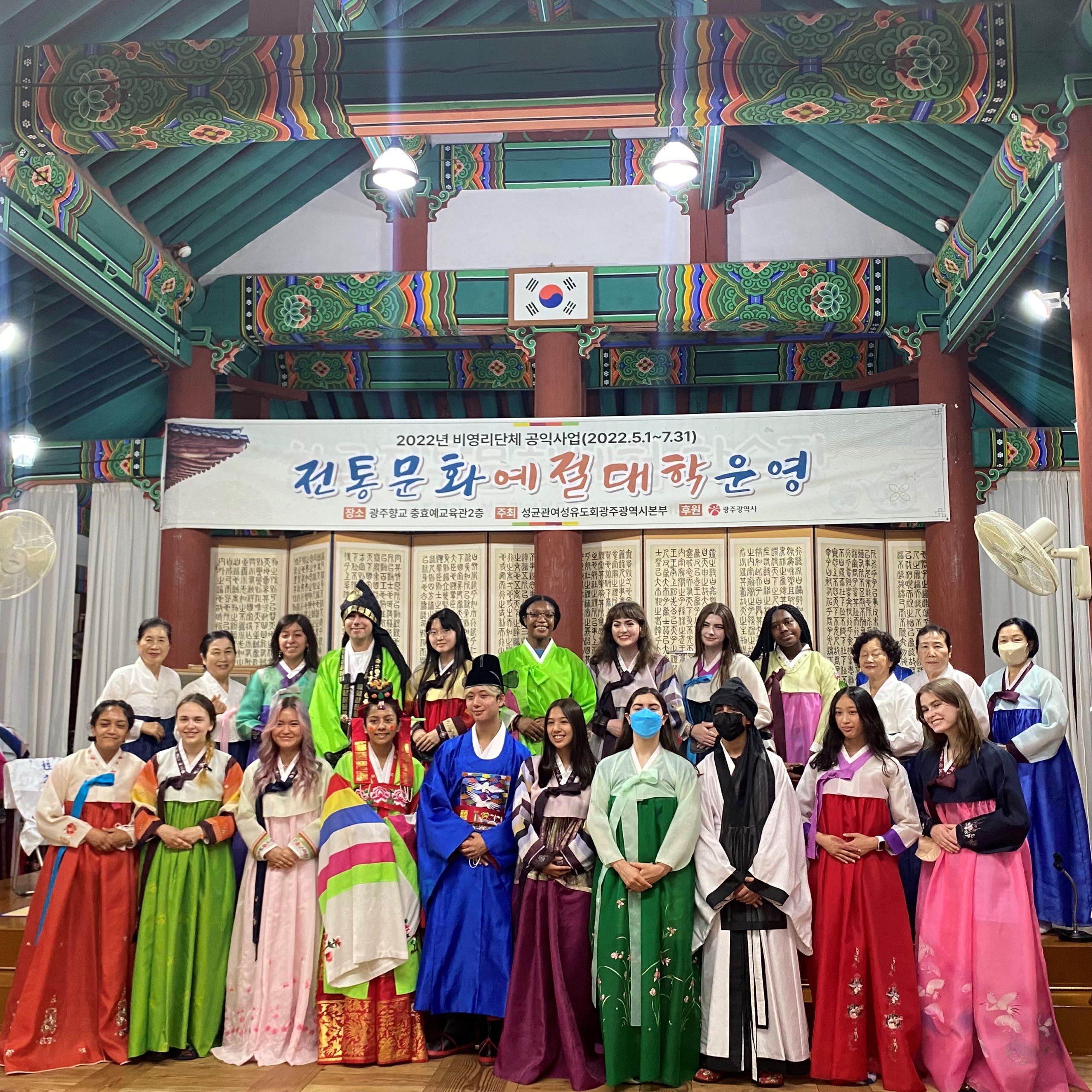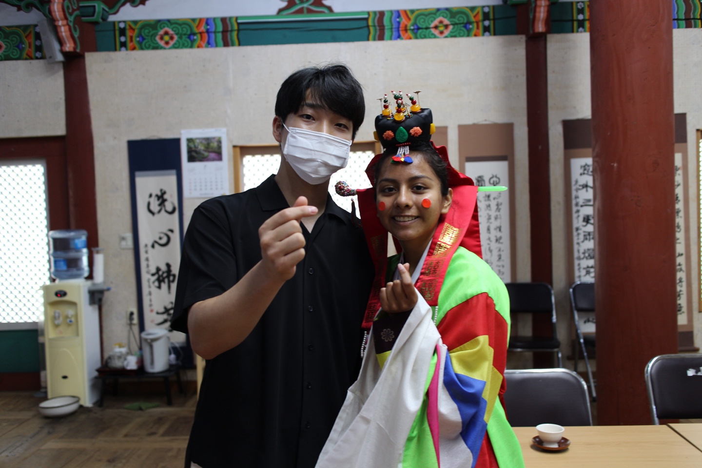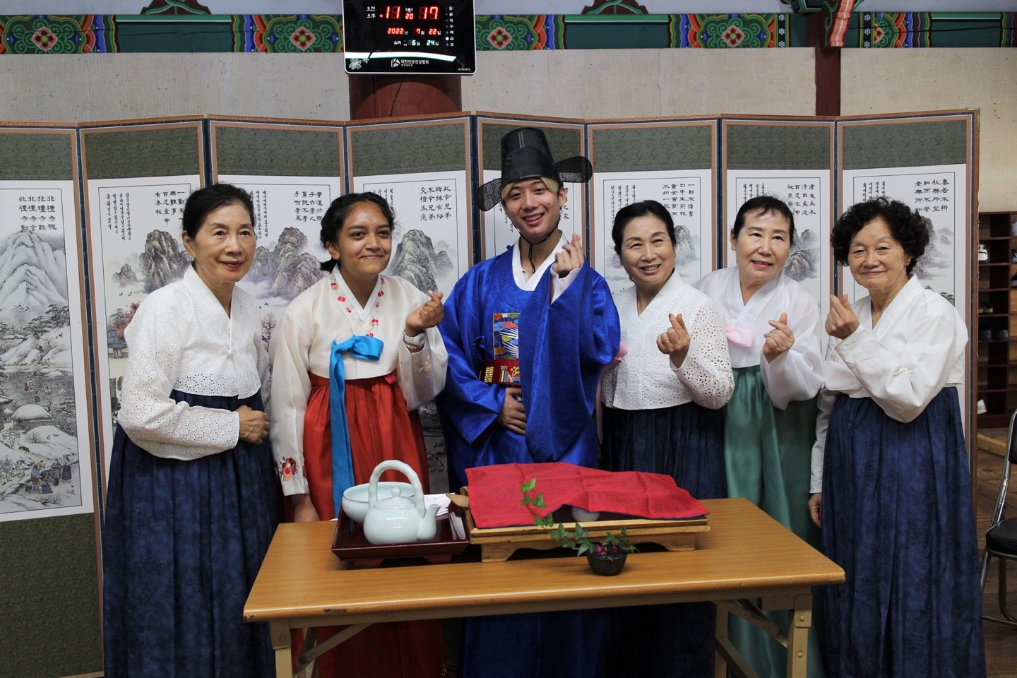Jayden and Daniela with several volunteers of the hyanggyo, wearing traditional dress and showing the popular “finger heart”.