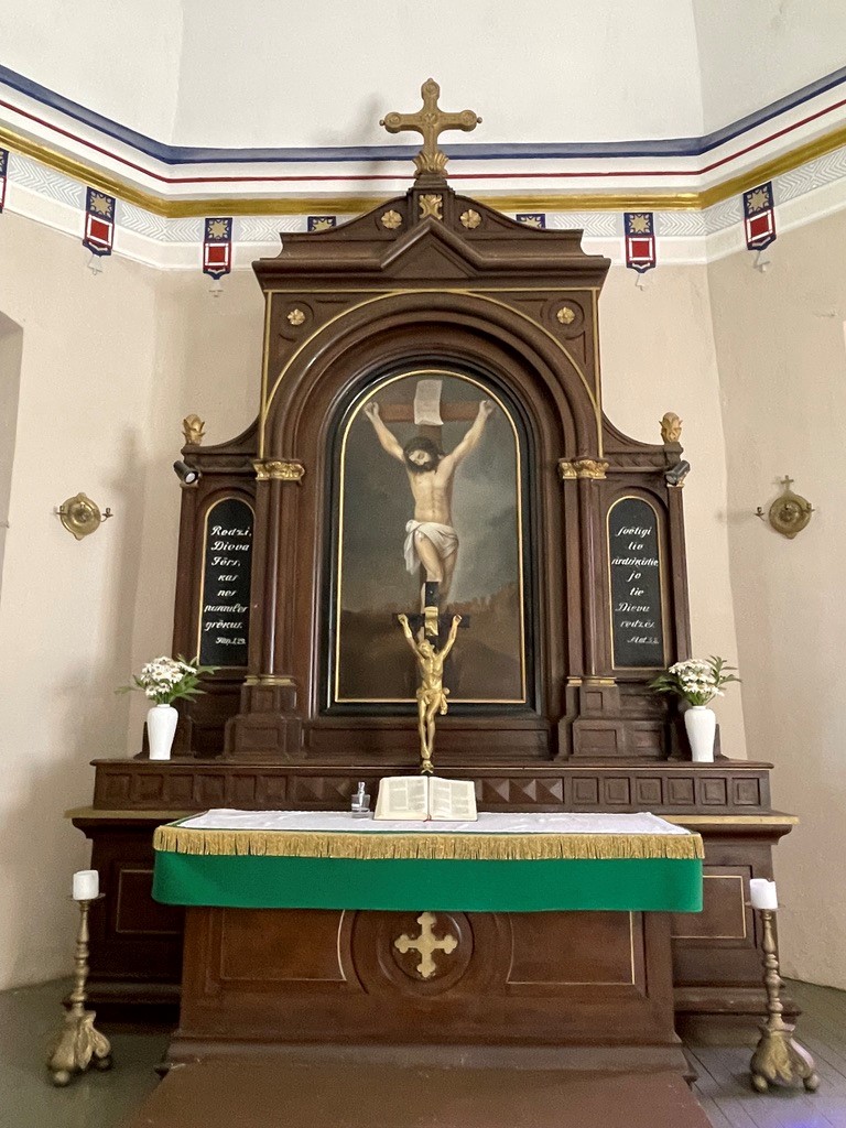 The church features an organ, altar, raised pulpit and wooden pews.