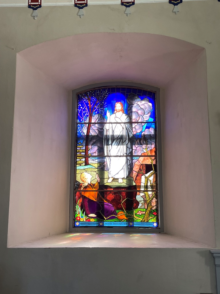 An early 20th-century stained glass window in the church.