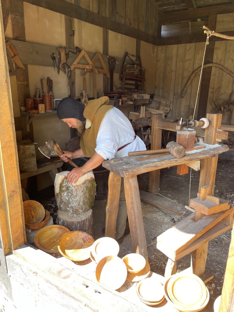 An artisan demonstrates how wooden dishes were made using medieval techniques.