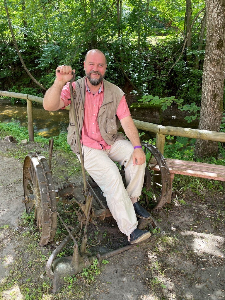Our tour guide tries out old equipment used to cut hay.
