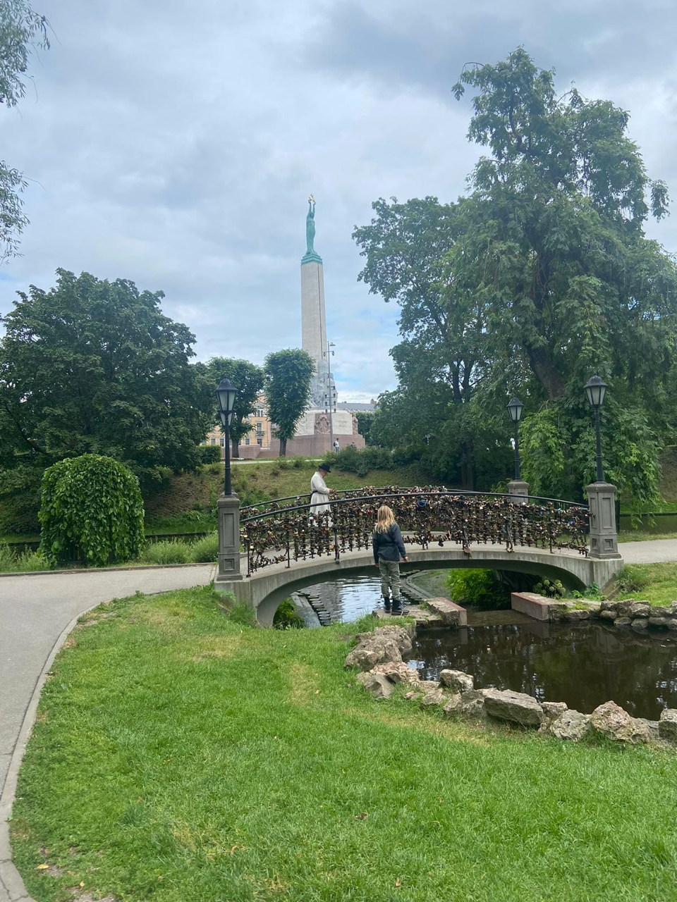 “A picture of the Latvian freedom monument from Bastejkalna Park with the lock bridge in the foreground.” -Andrew
