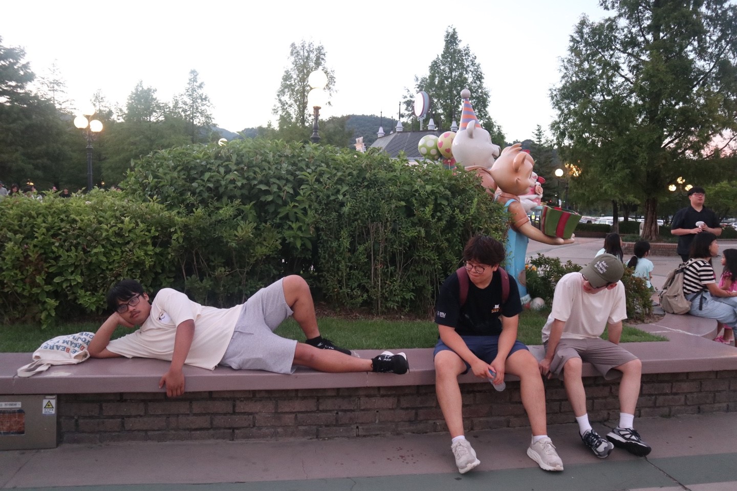Radley, Andy, and a Korean peer take a break while at Everland.