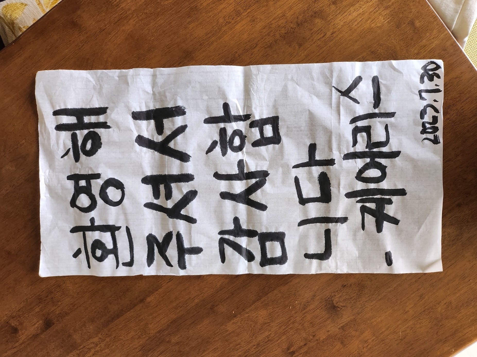 Charis’s Korean calligraphy done for her host family. It reads: “Thank you for your hospitality -Charis”.