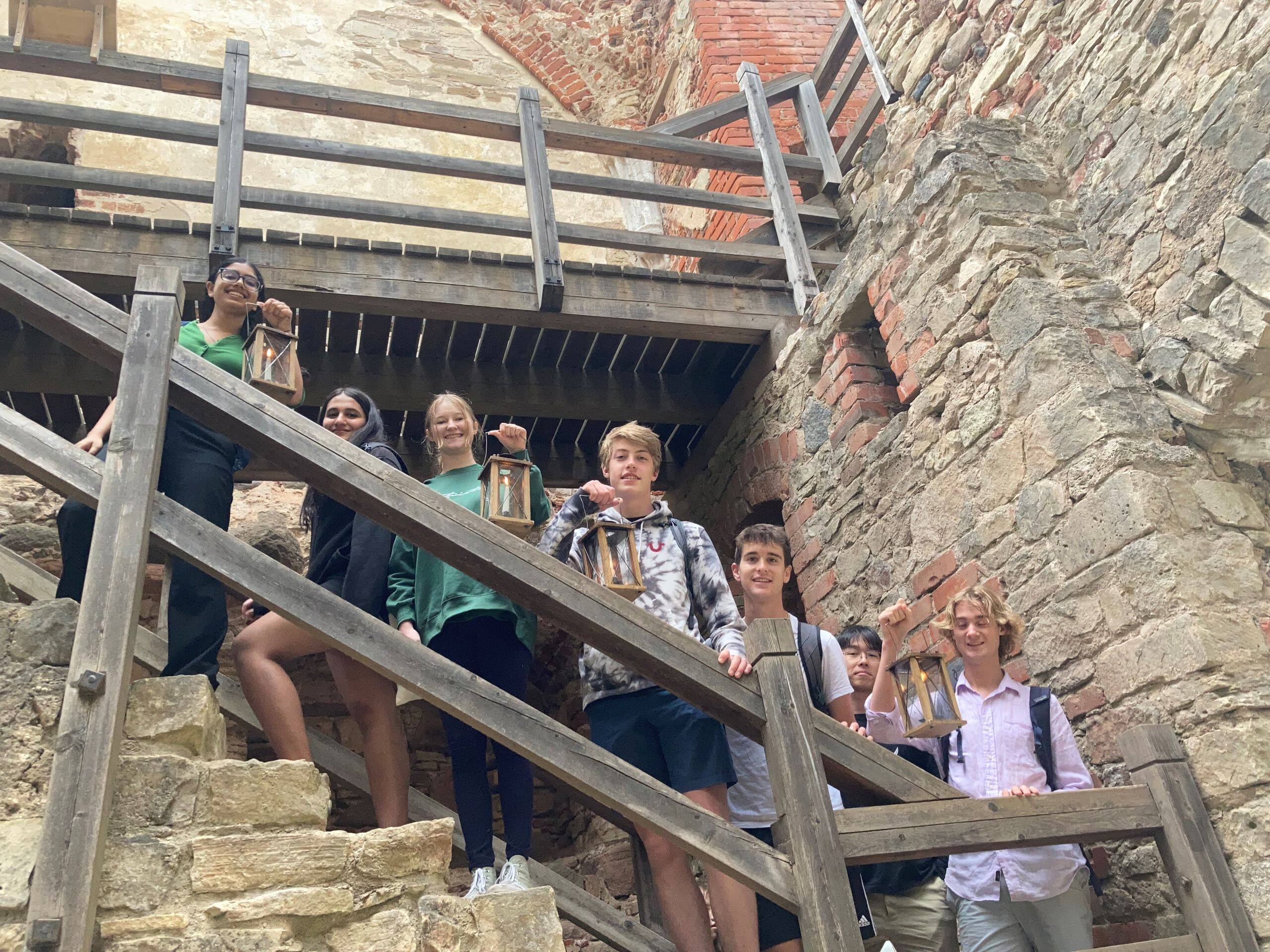Meera, Kira, Sam, and Fletcher show off their lanterns before entering the dark interior of Cēsis Castle. Nyrah, Caleb, and Jonathan also pictured.