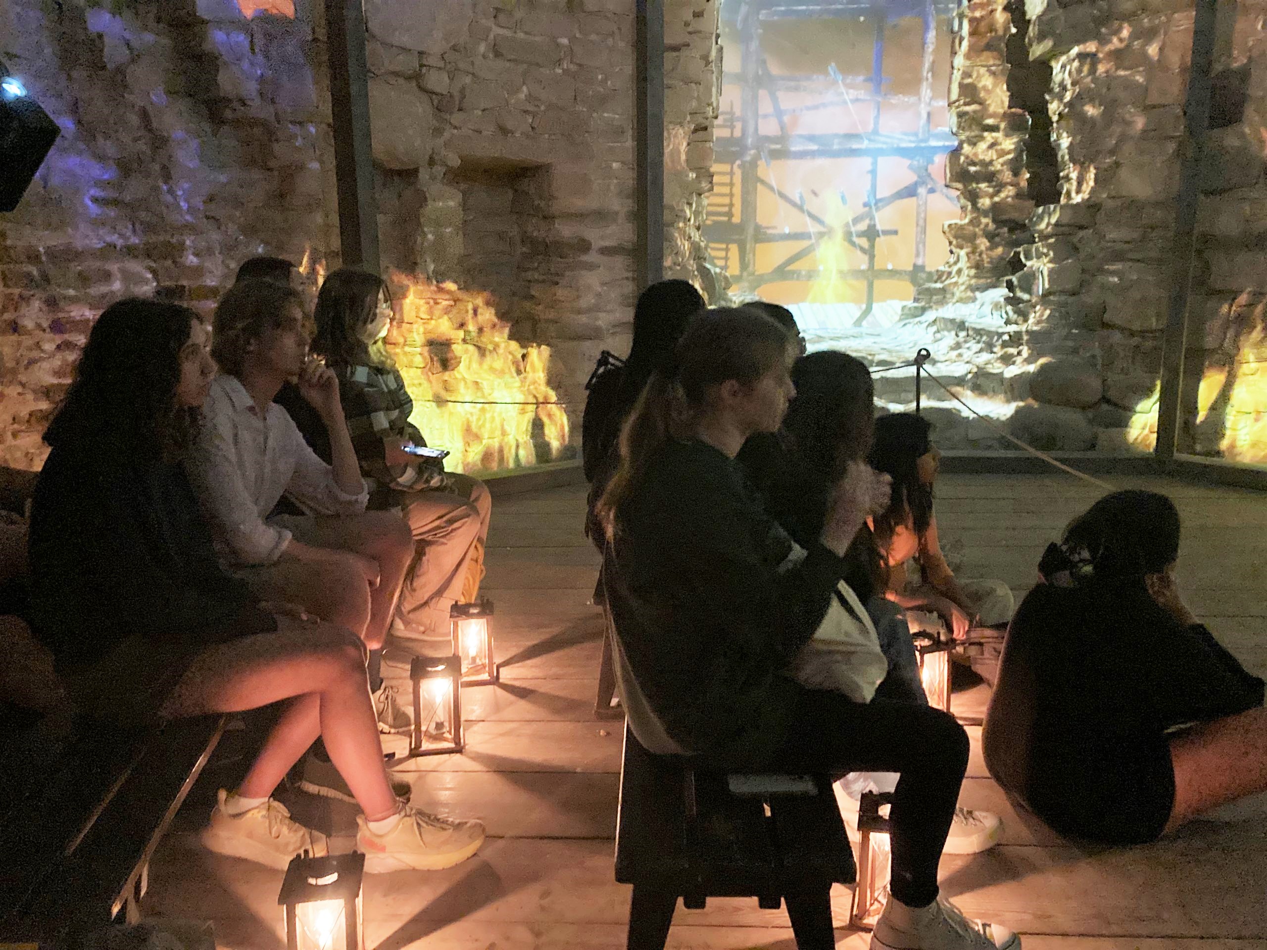 Students view an exhibit in Cēsis Castle, illuminated mainly by their lanterns.