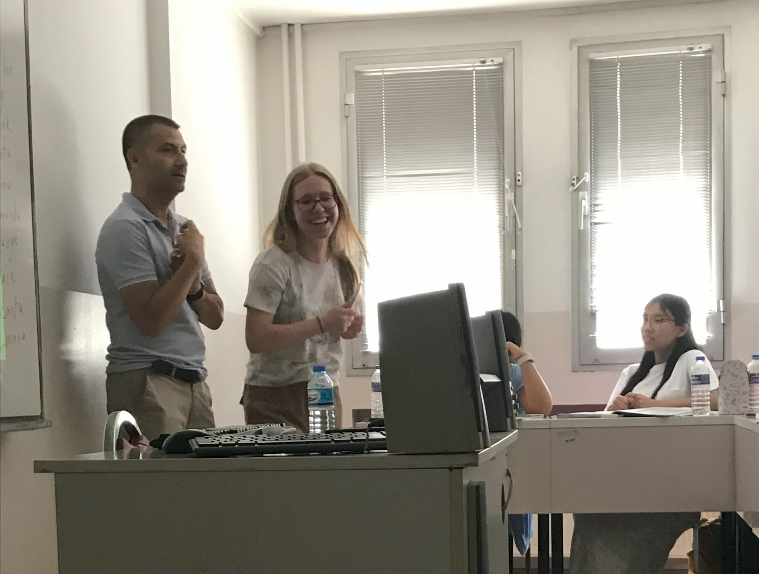 Class isn’t all grammar and workbooks. Anna helps lead a game from the front of the class with Murat Hoca’s help.