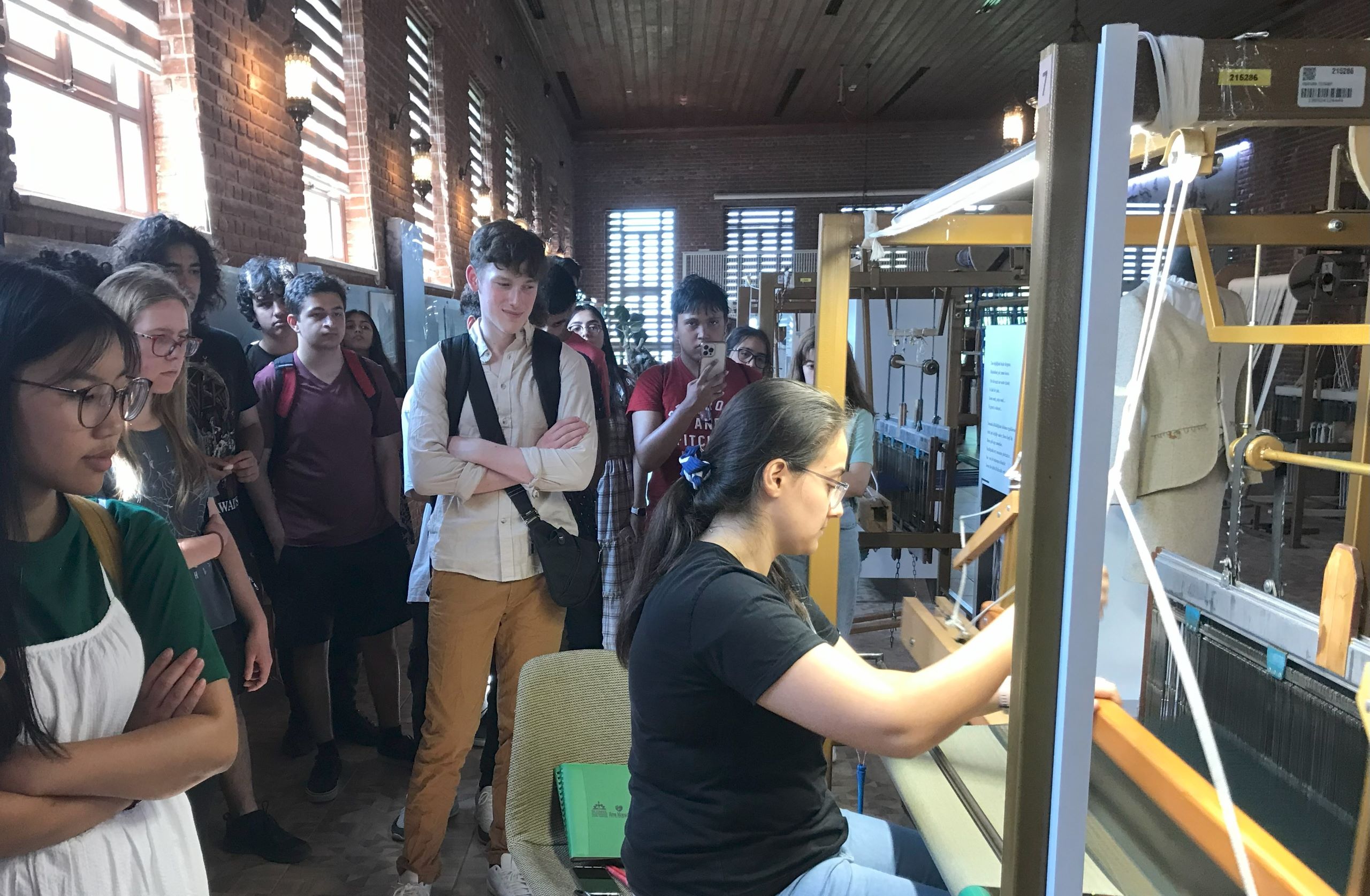 Students also get to see how silk thread is transformed into finished products by hand or, as pictured here, by mechanical looms.