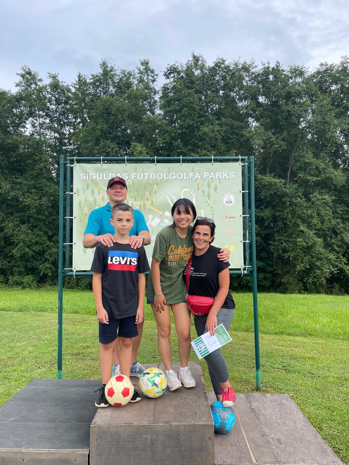 Yuxuan with her host family about to play mini golf with soccer balls in Siguldu.