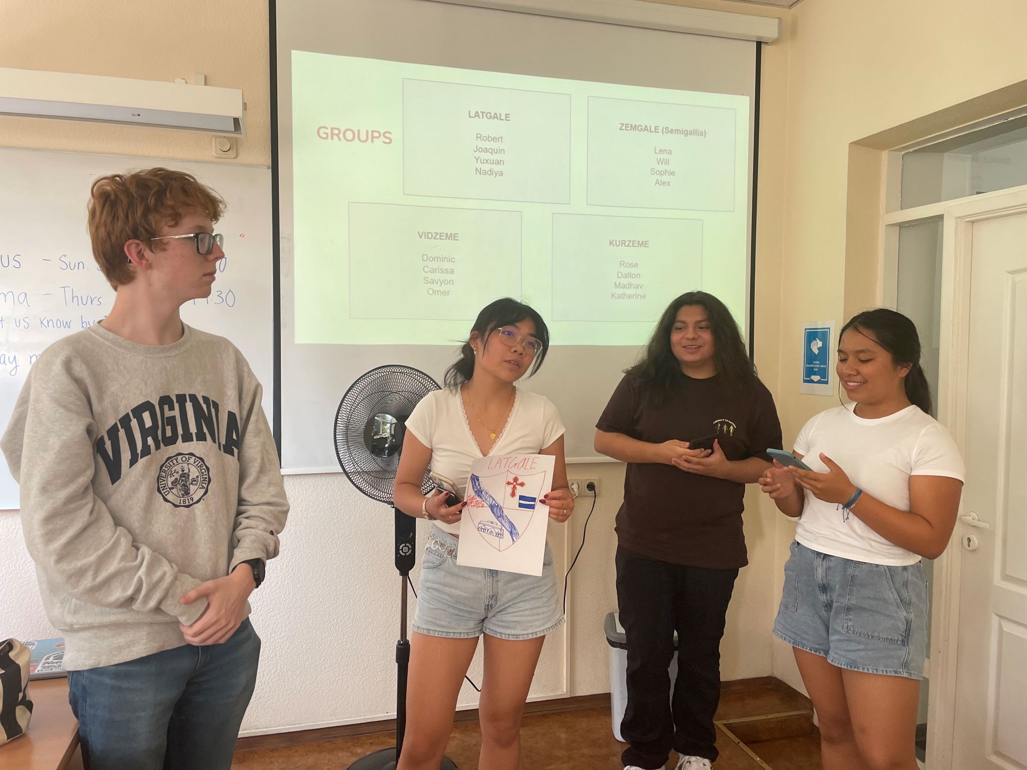 Robert, Yuxuan, Joaquin, and Nadiya presenting on the Latgale region of Latvia and sharing the flag they made for it.