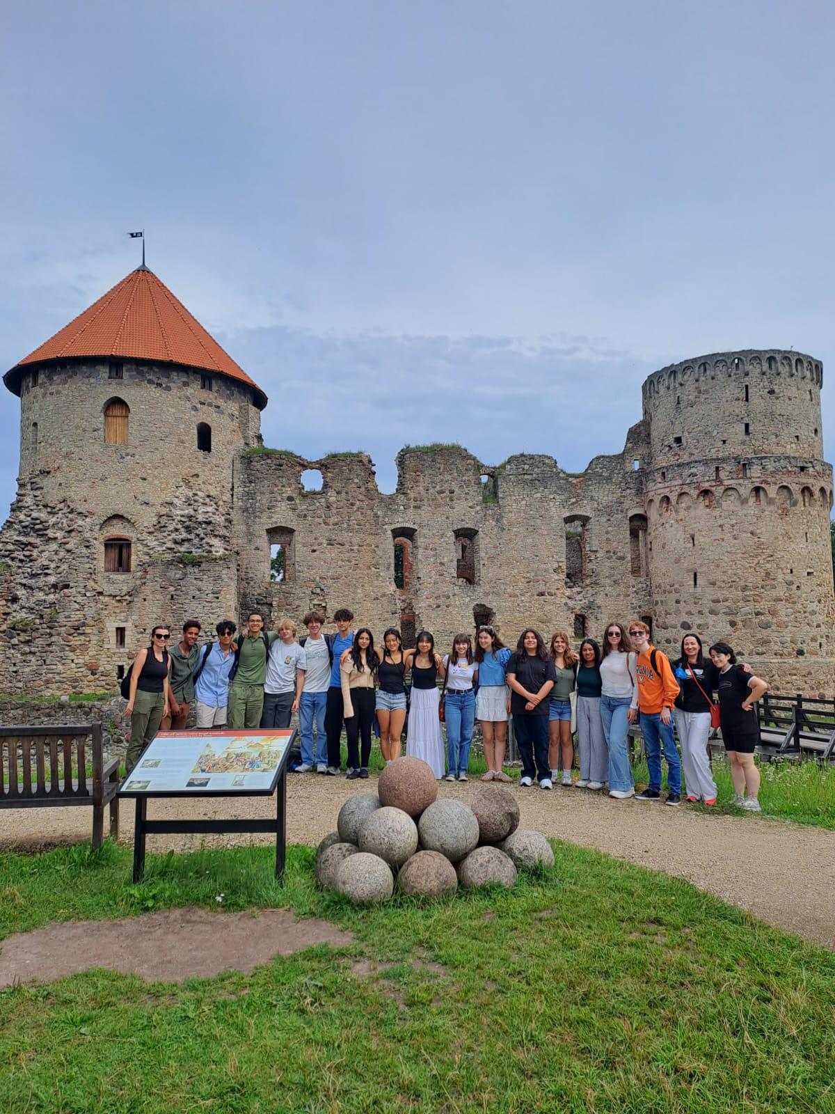 The entire туса 16 group standing in front of the Cēsis Castle.