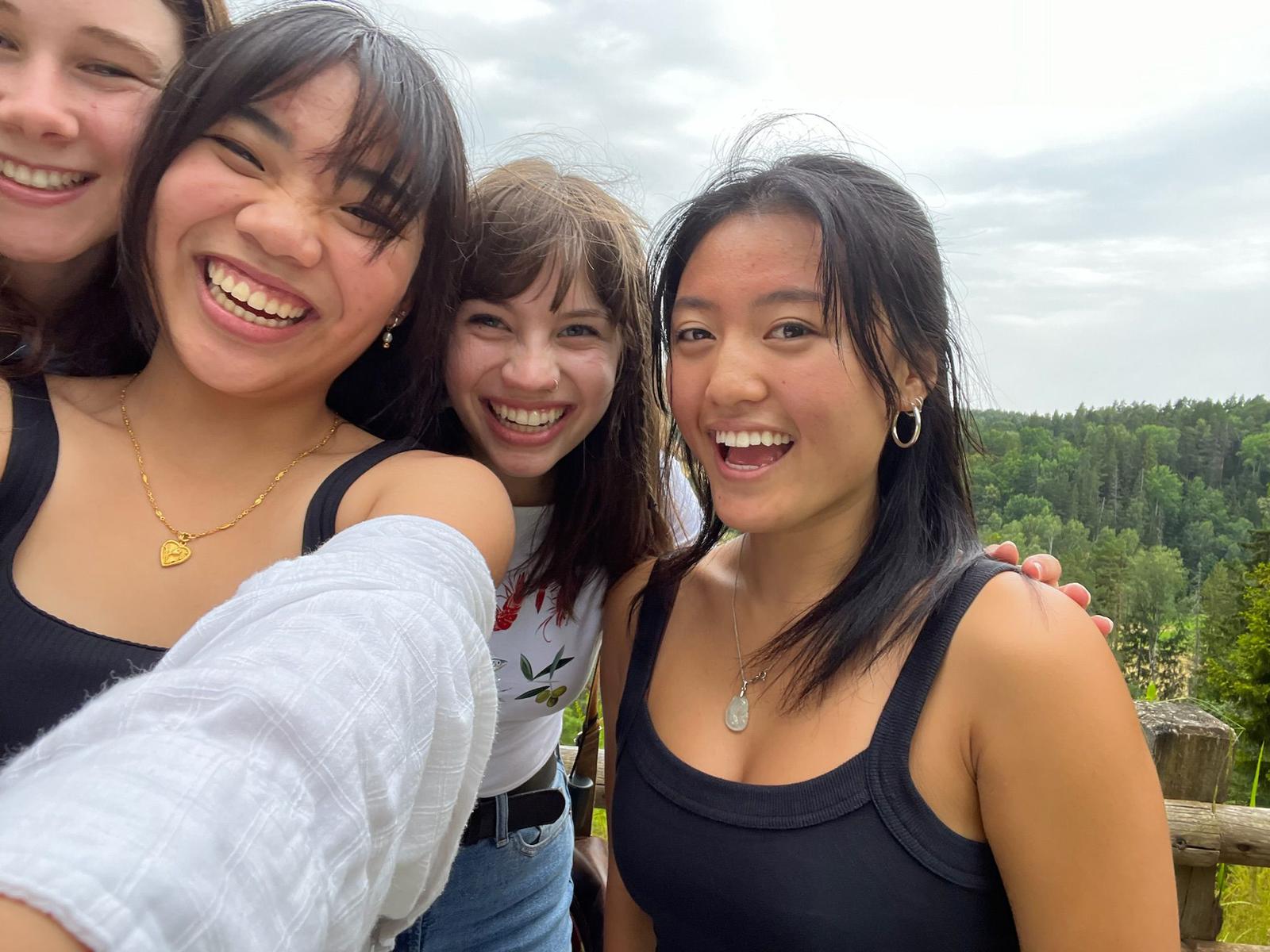 Rose, Yuxuan, Lena, and Carissa taking a selfie at the top of the Ērgļu Cliffs.