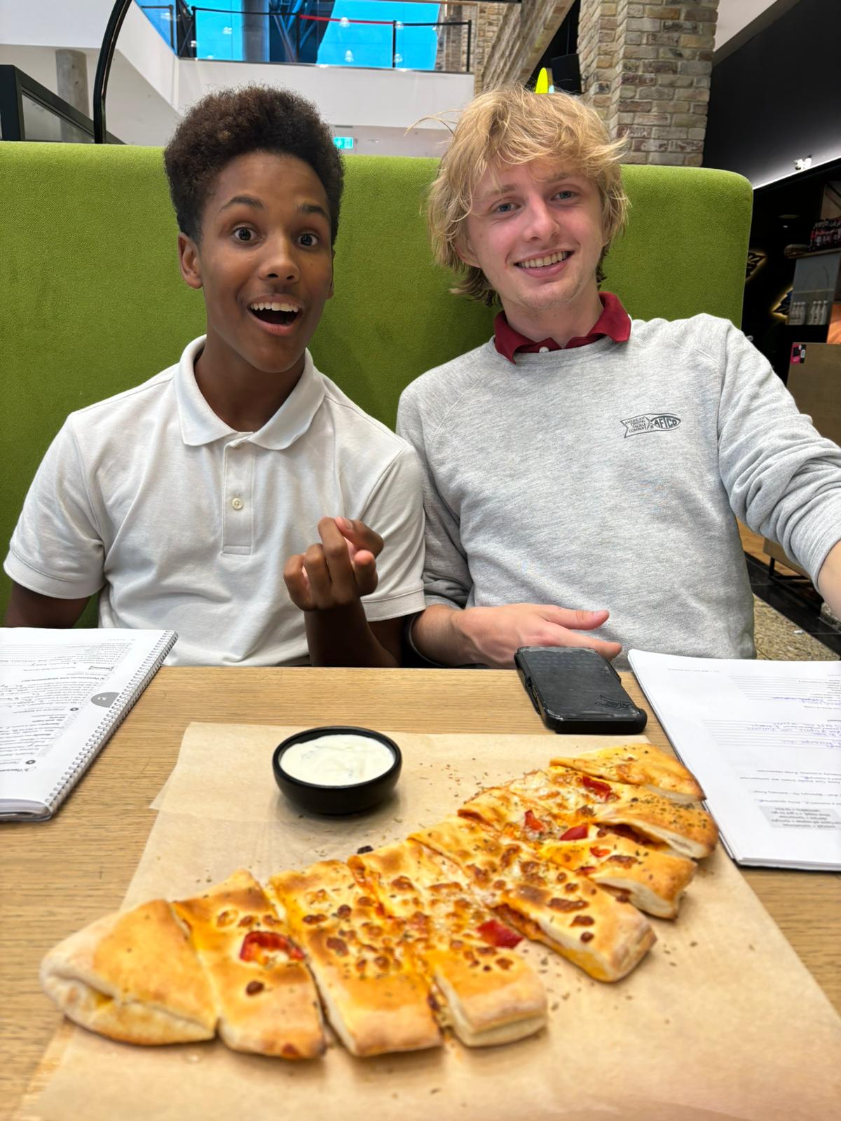 Dom and Dalton working on homework while eating at a local restaurant at Acropole mall.