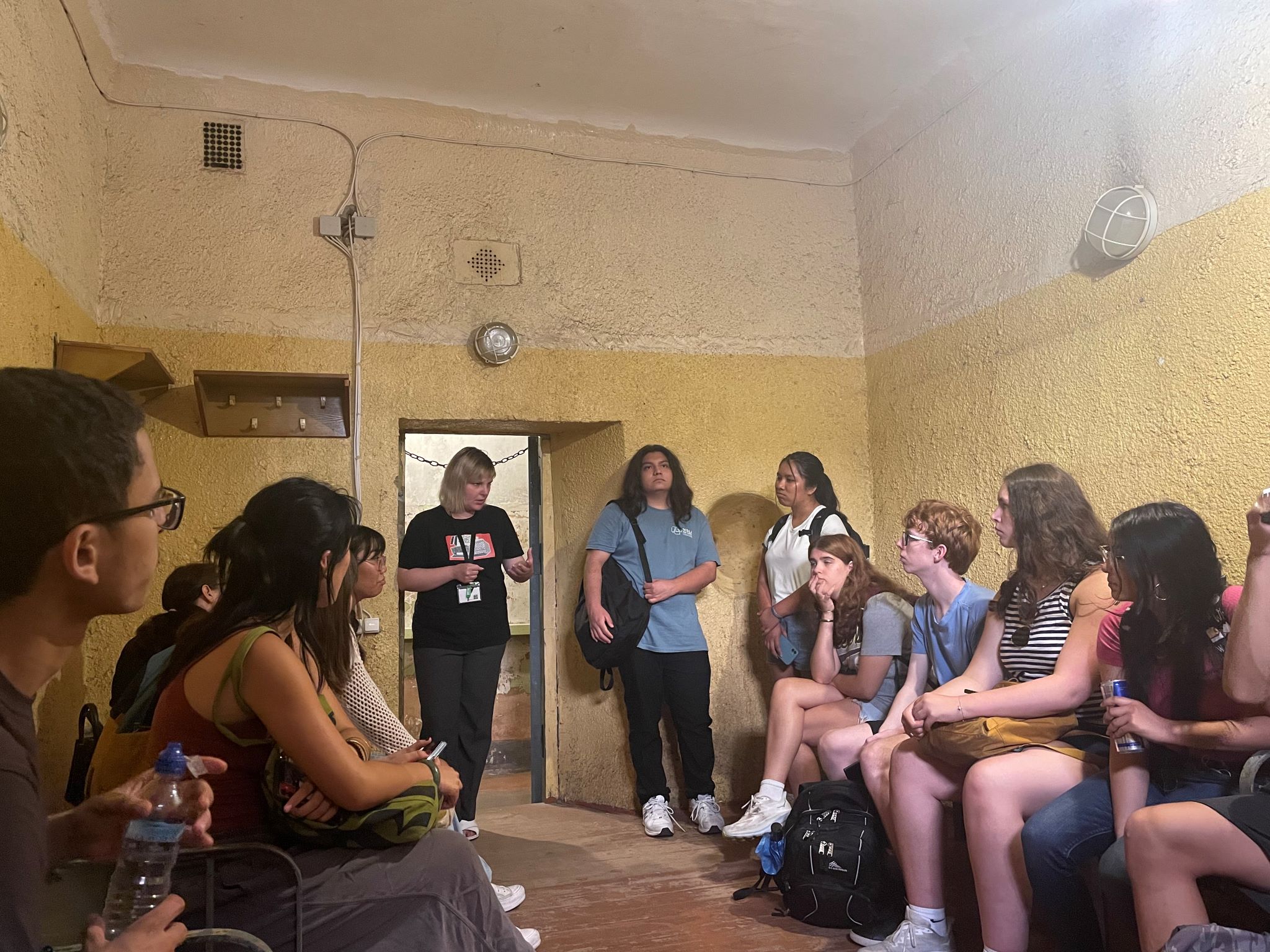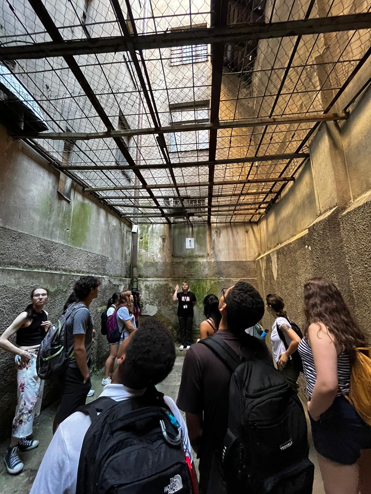 Students listen to the tour guide describe prison conditions in the KGB headquarters.
