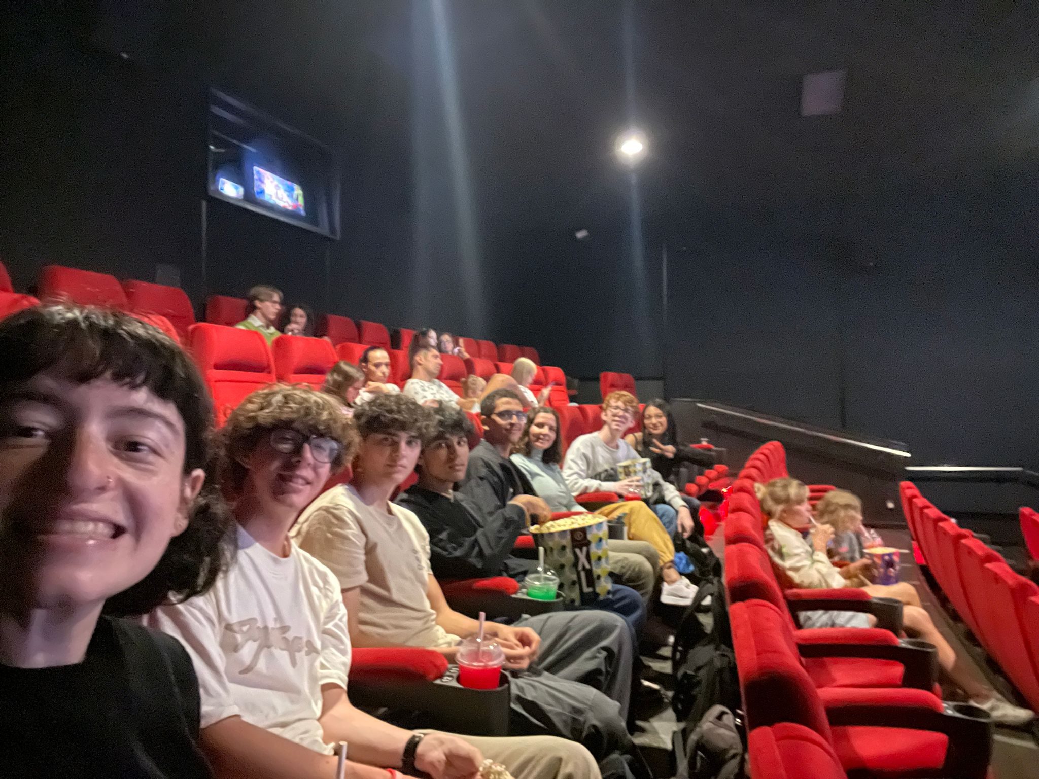 Rachel, Alex, Will, Madhav, Omer, Madeline, Robert, and Kathrine take a selfie in the movie theater before watching Inside Out 2.