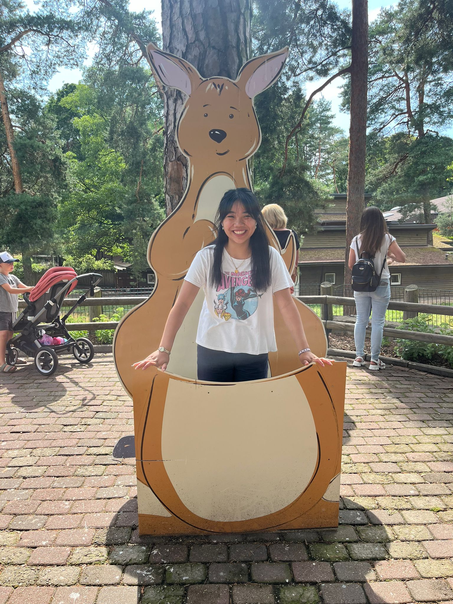 Yuxuan stands voguishly inside of a kangaroo structure at the Zoo.