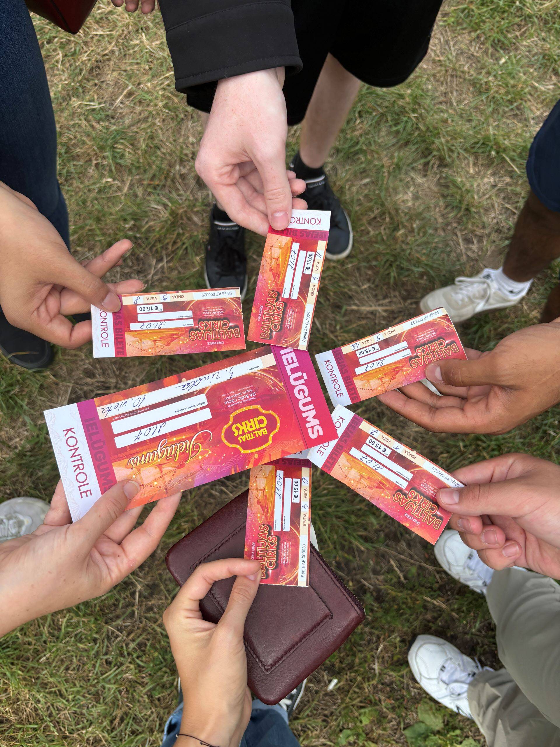 The circus goers take a circular group photo of their tickets.