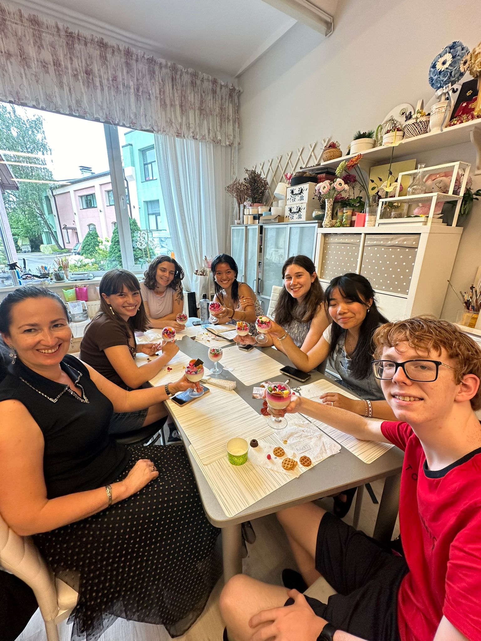 Tatijana (our local coordinator), Lena, Madeline, Carissa, Rose, Yuxuan, and Robert hold up their finished candles.
