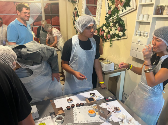 Madhav and Carissa create their own chocolates at the Laima Chocolate Museum.