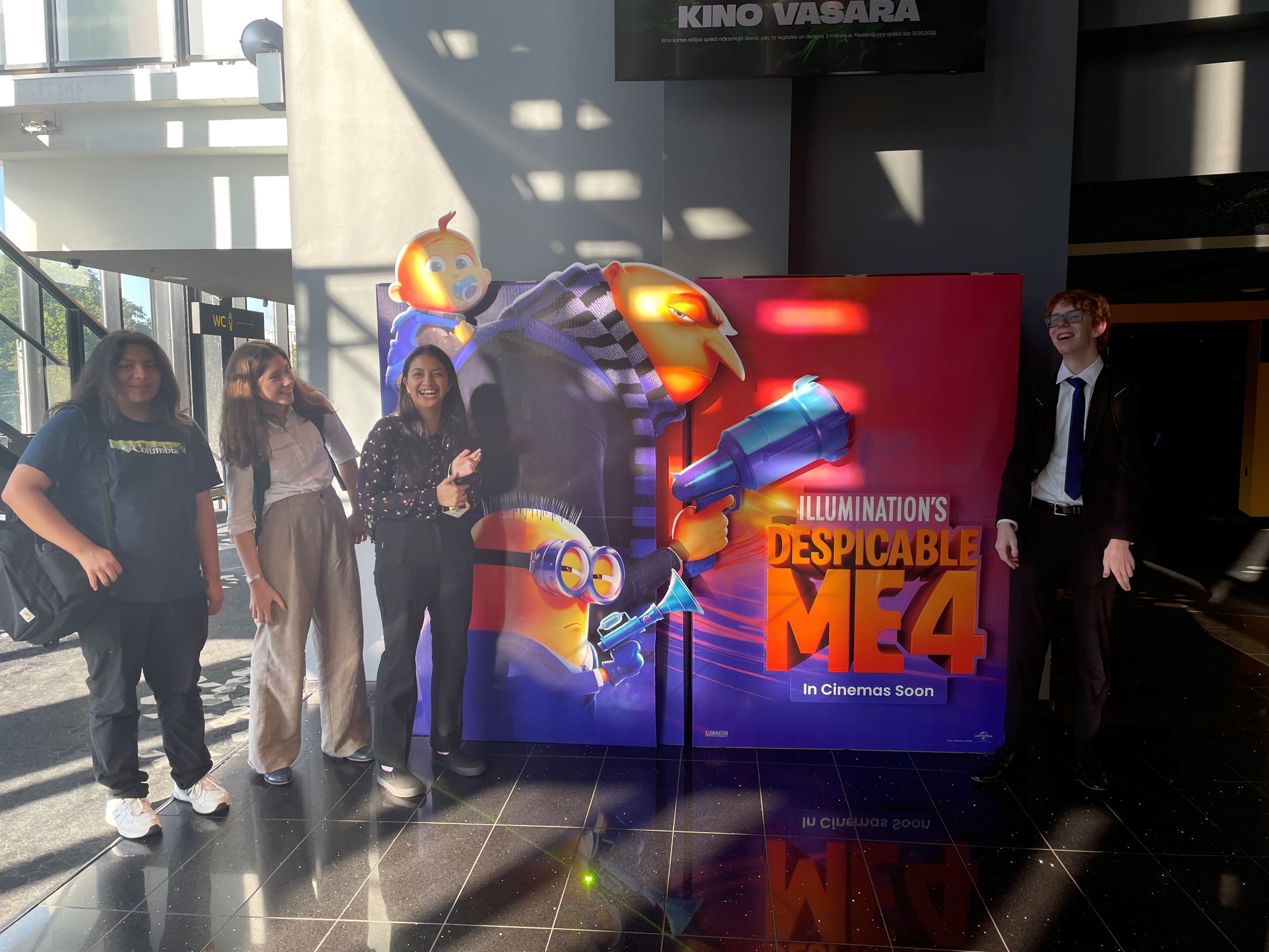 Robert, Rose, Joaquin and Katherine stand by the Despicable Me 4 poster at the movie theater.