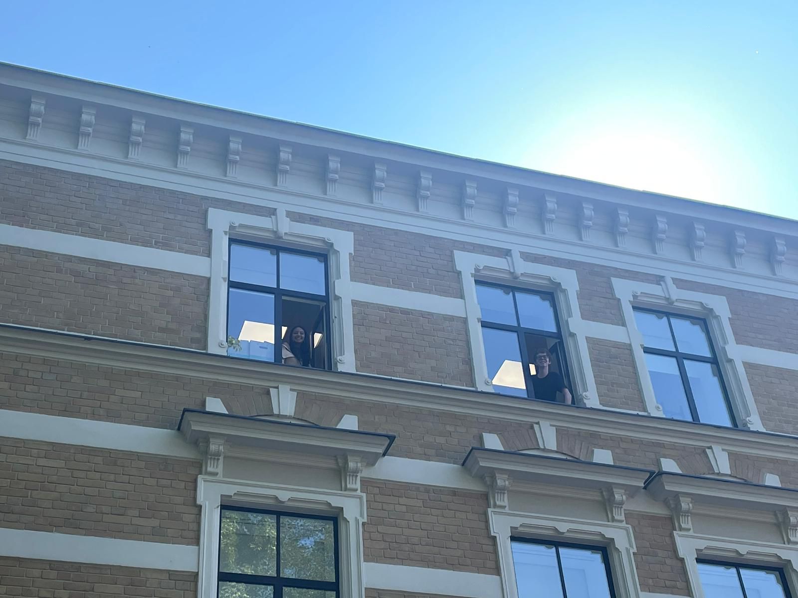 Katherine and Robert spotted through the window on a beautiful day in Riga.
