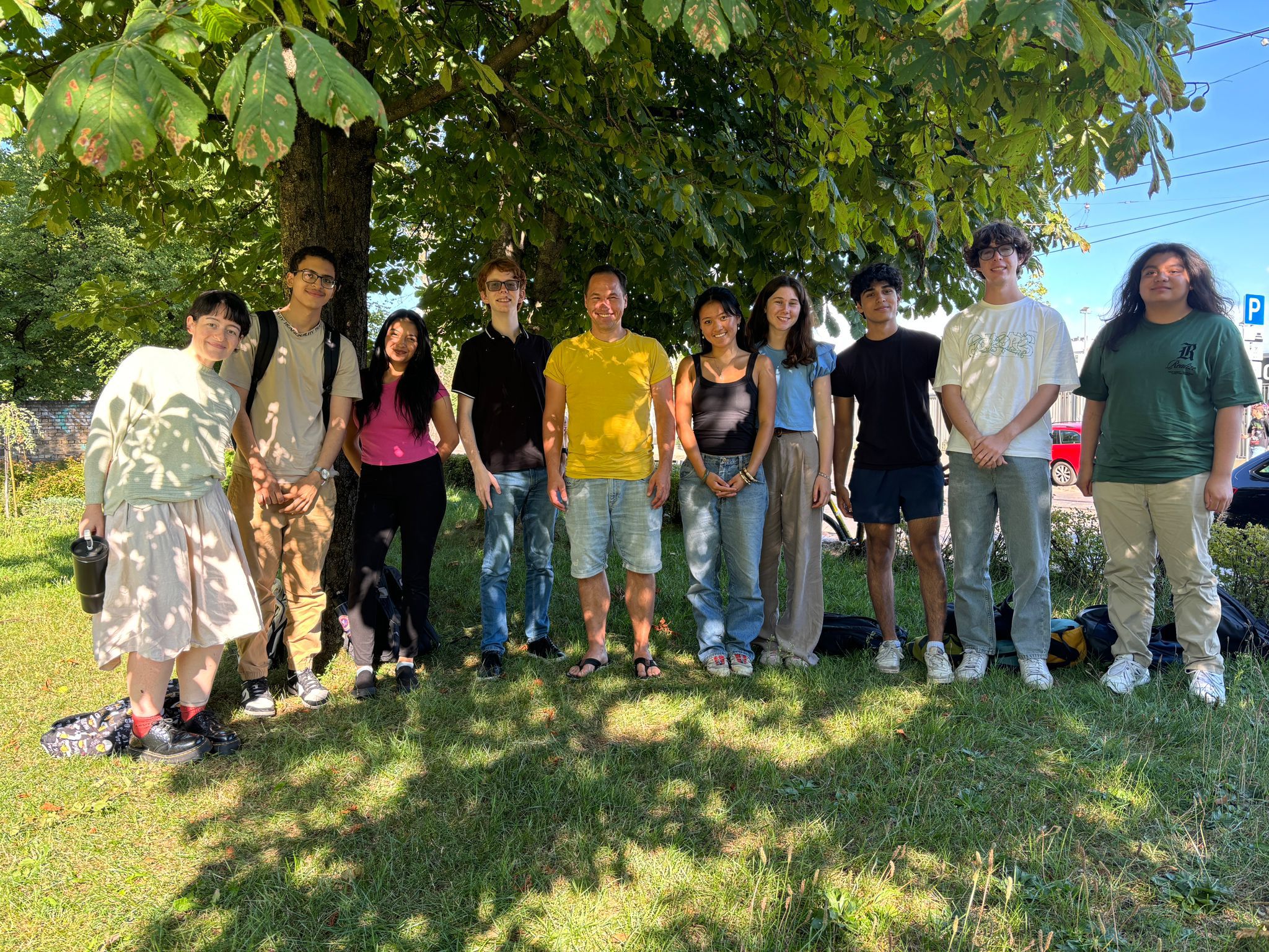 Students pose for a photo in the park with Latvian international security expert Maris.