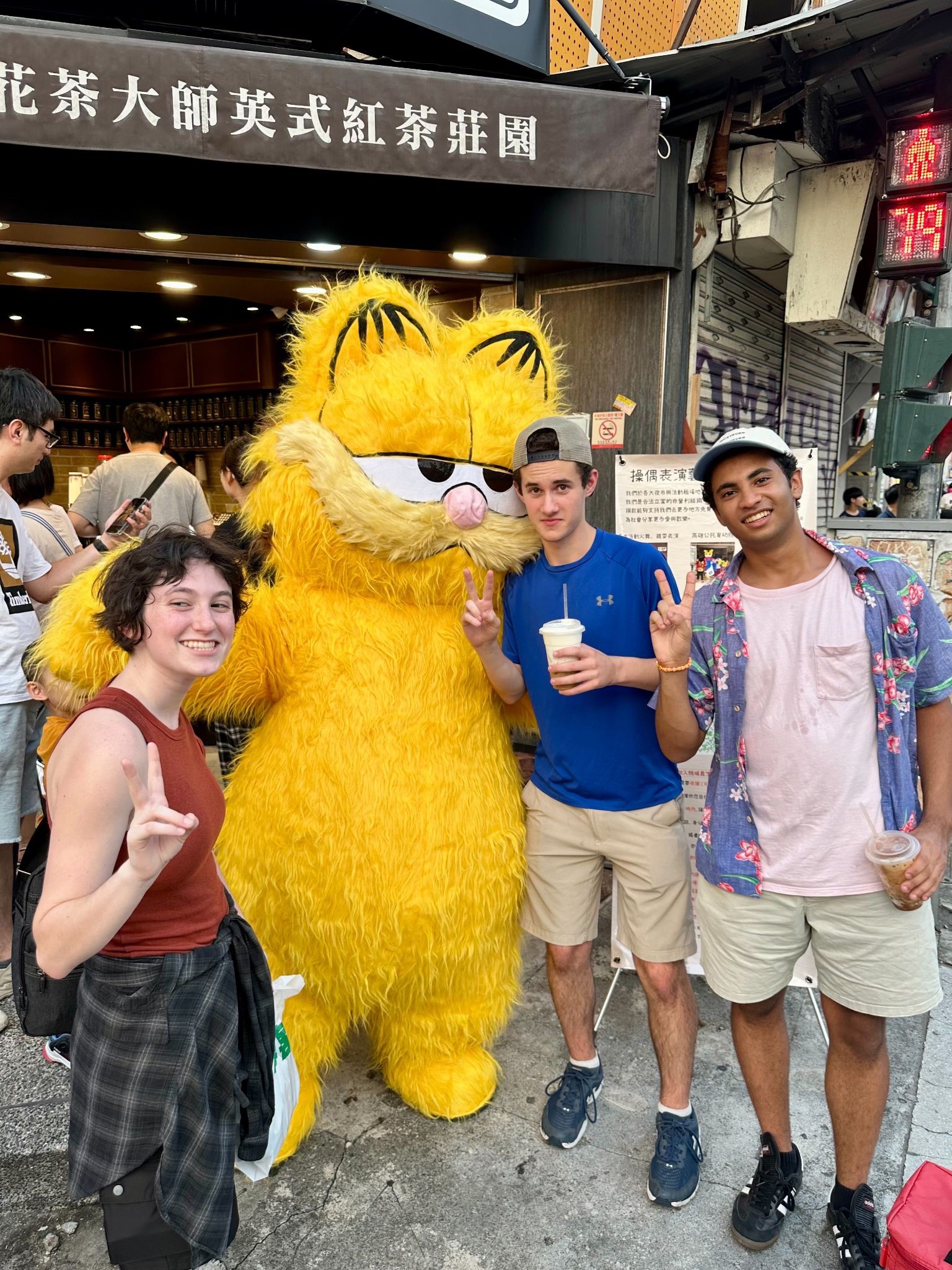 Elissa, Sam, and Gabriel S. find Garfield at Fengchia Night Market in Taichung!