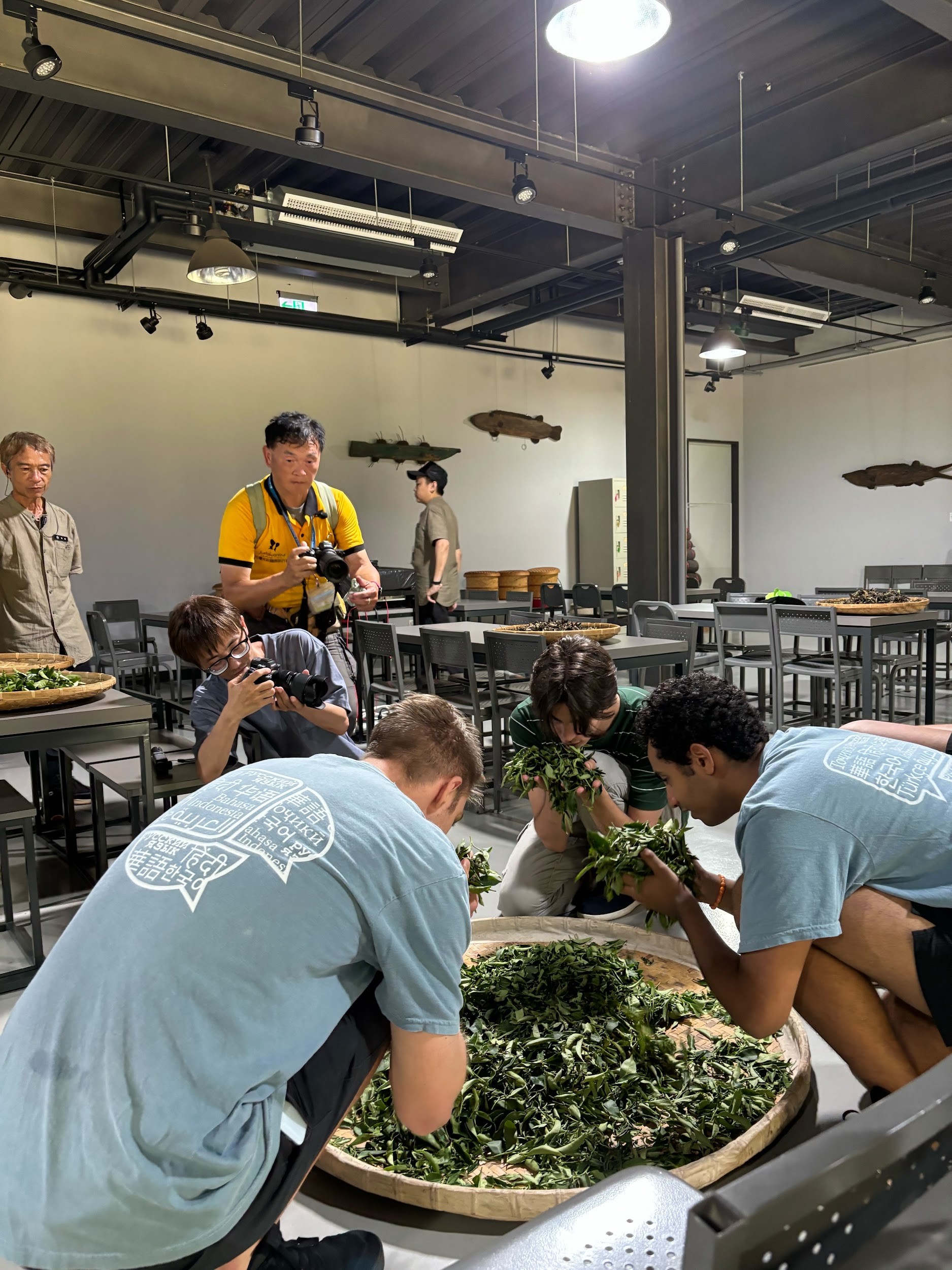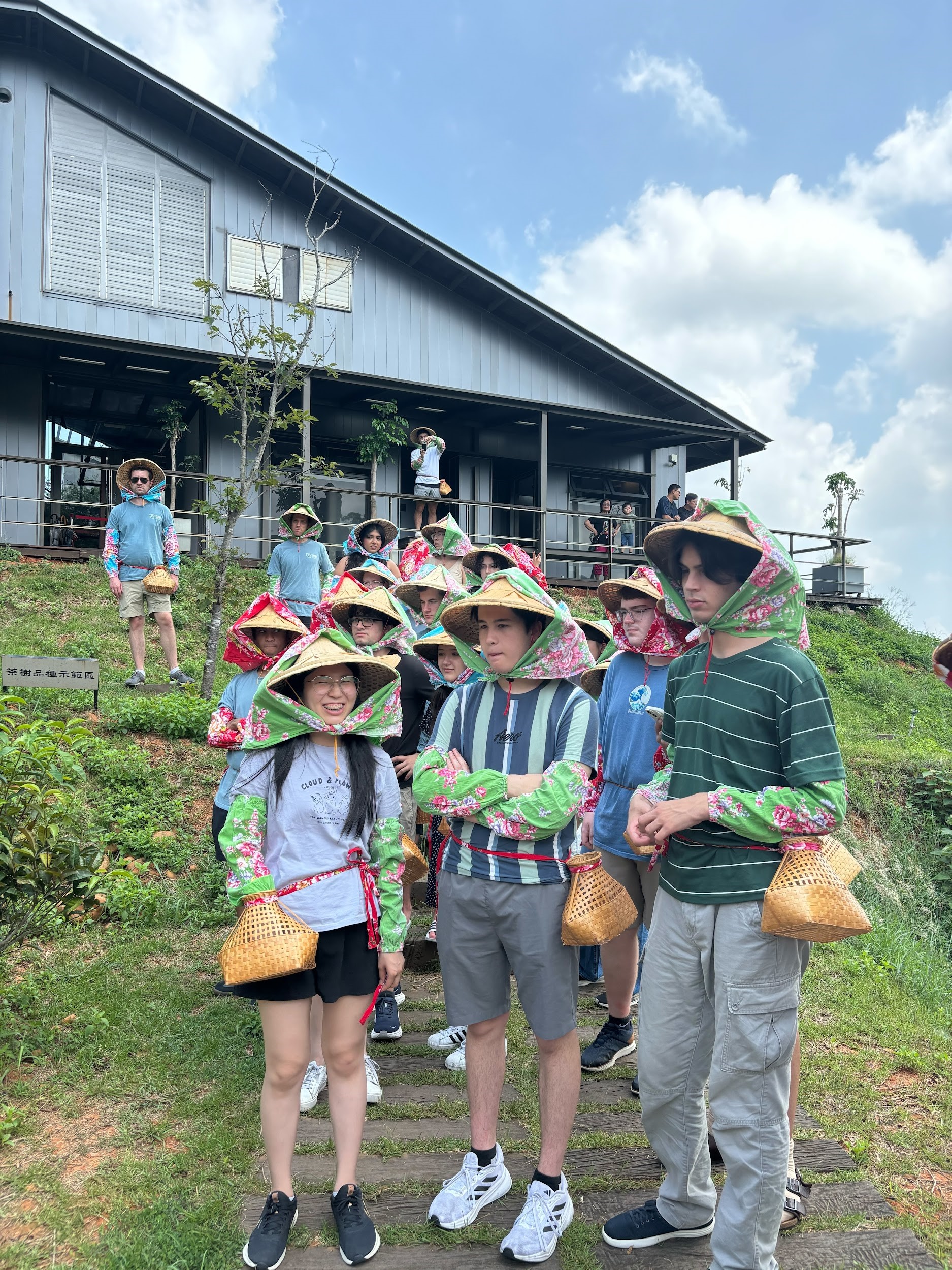 Listening to tea-picking instructions in the very hot and humid climate of Taiwan.