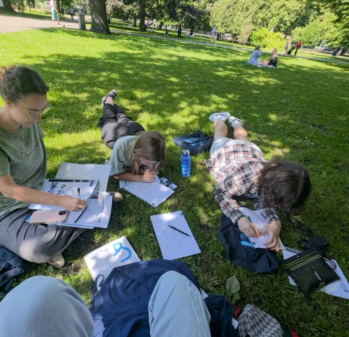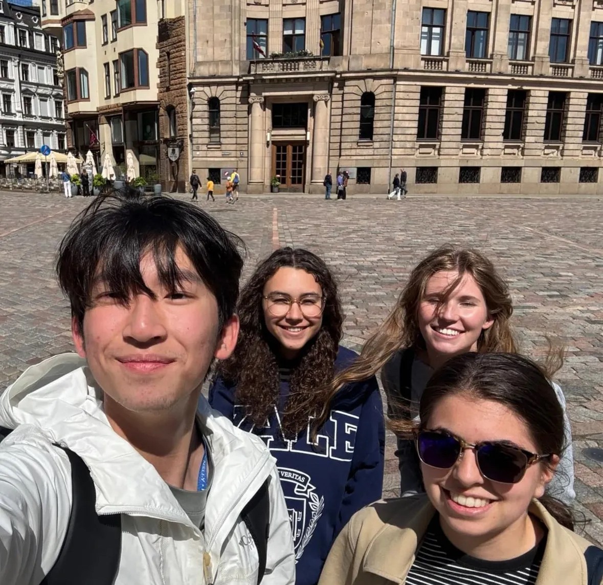 Students Malia, Ella, Silvano, and Xavier (taking the picture) studying Russian in one of many parks in Riga!