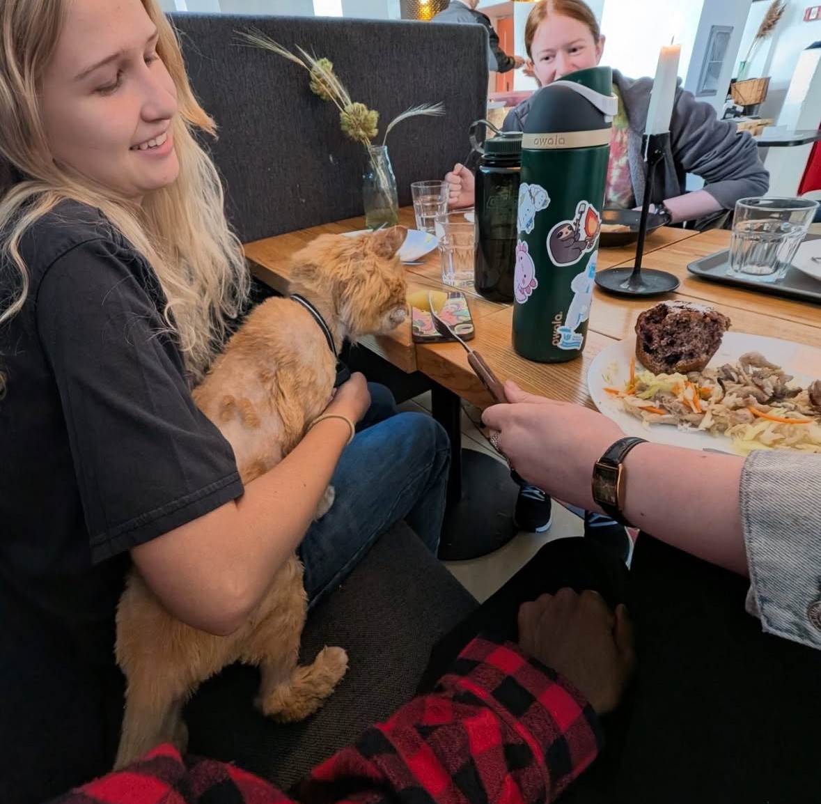 Students Veronica and Astrid enjoying the company of a cat at our lunchtime location!