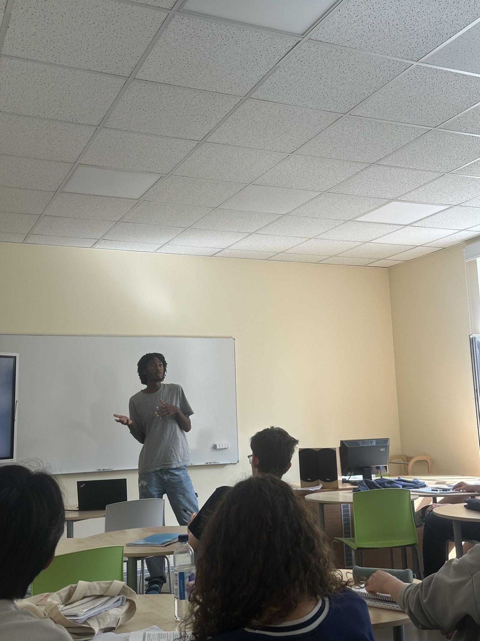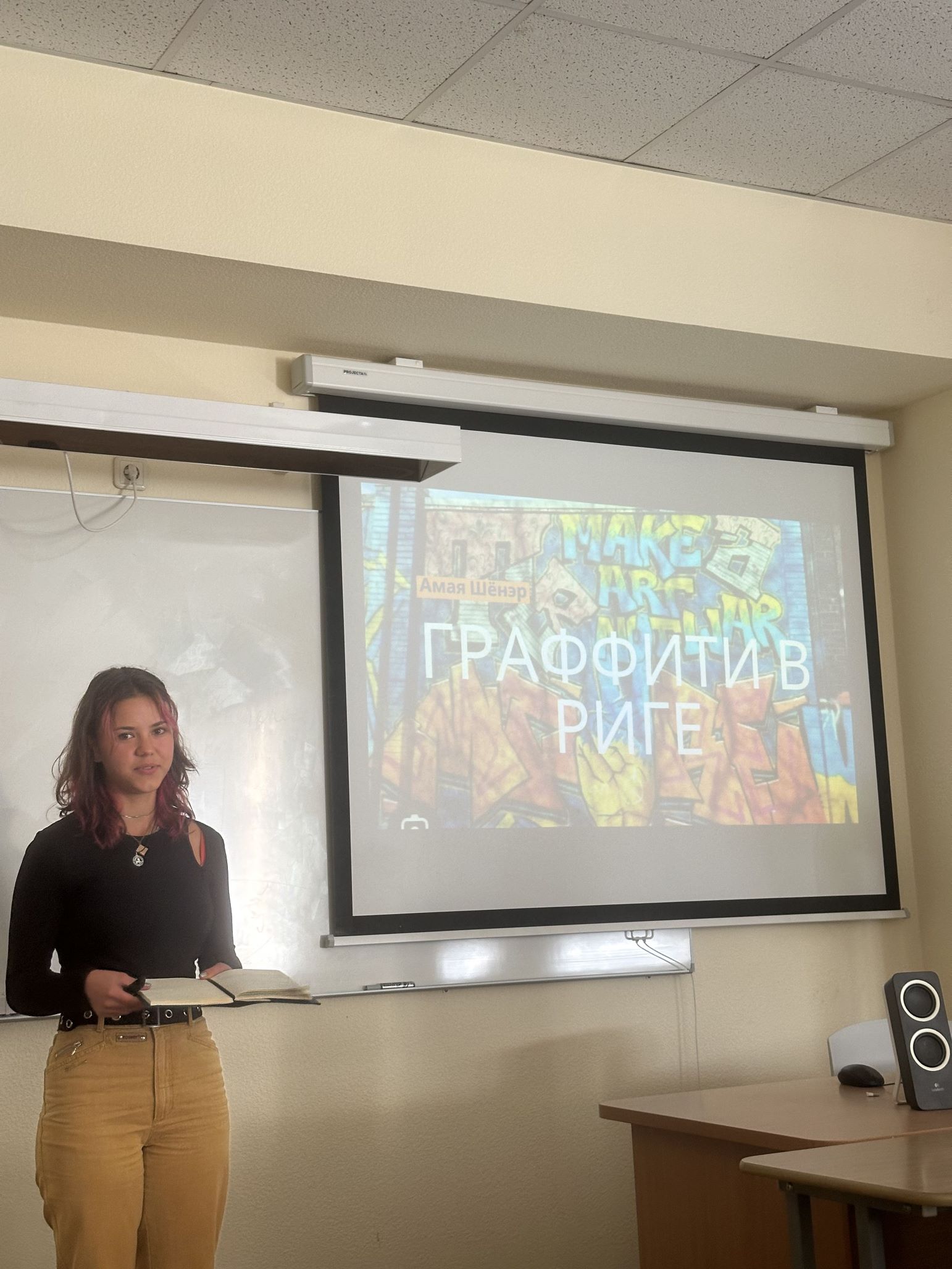 Amayah gives a presentation on popular opinion about graffiti in Riga.