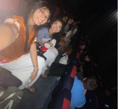 Students at the movie theater, both in their seats and having fun while waiting for the movie to start!