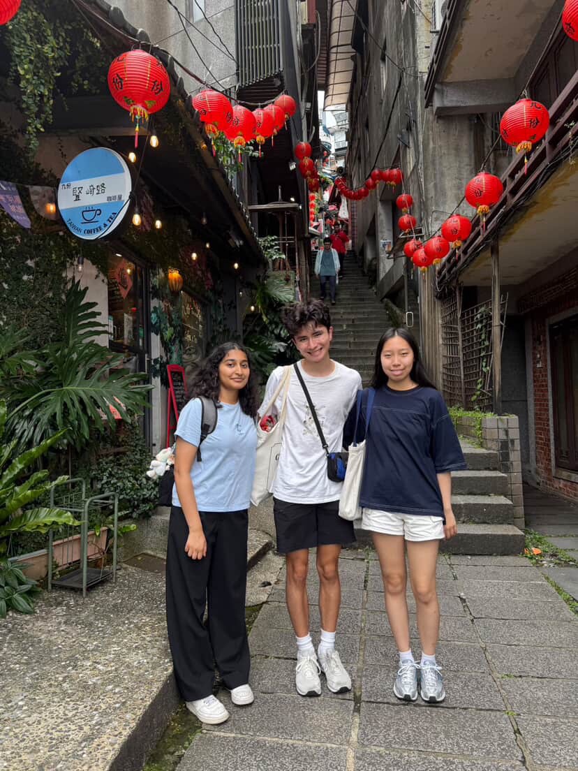 Kelly, Tommy, and Nitya on a picturesque street in Jiufen.
