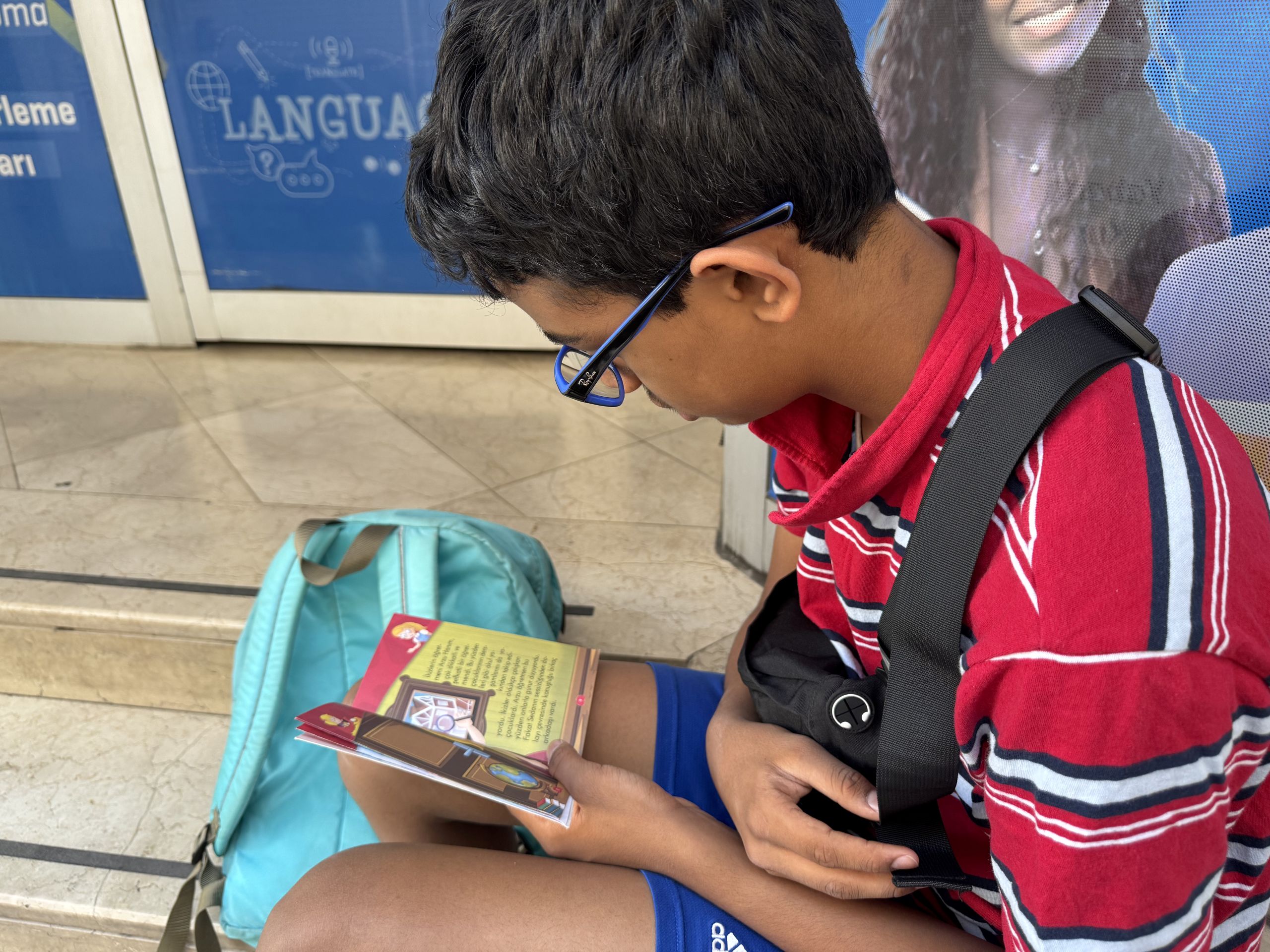 Puru practices his language skills before school by reading through a Turkish children’s book