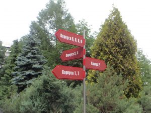 The buildings don’t have names—only numbers. Here are signs indicating where to find the nine buildings that make up the campus.