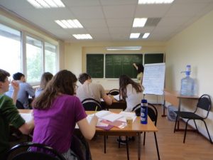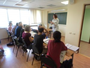 Here is the other group of students with their teacher. Notice the big bottle of water on the table to the right. Traditionally, Russians don’t drink a lot of water. More than any other beverage, they prefer tea. Since my students and I are accustomed to drinking water at home in the States, our program arranged to have water available in the classrooms for us. (As in much of Europe, drinking fountains in public buildings are highly uncommon in Russia.)