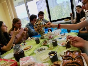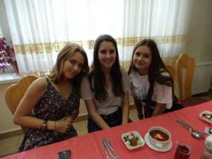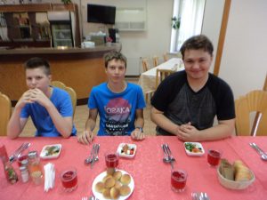 The camp staff set up a beautiful table for us and served salad, borscht, chicken, and potatoes, accompanied by Russian compote to drink.