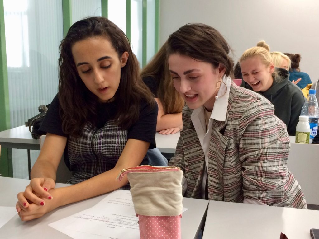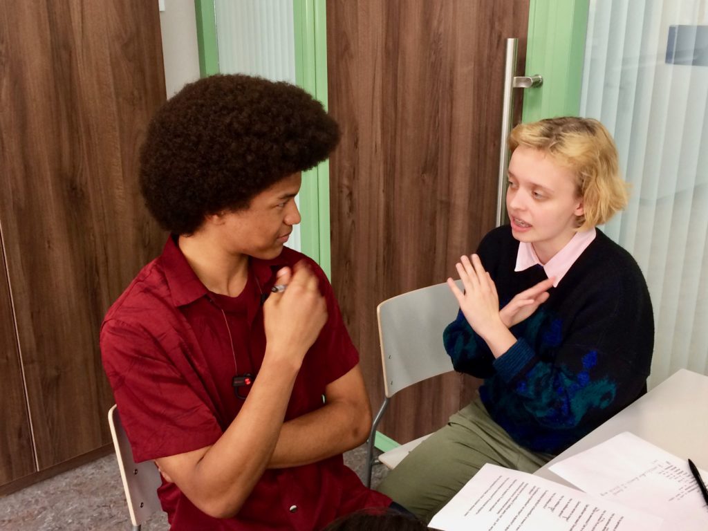 Xavier and Elizabeth practice a dialog in class.