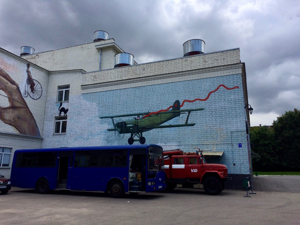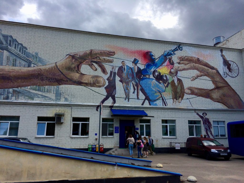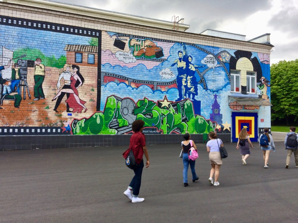 Several of the buildings on the grounds of the studio feature murals with scenes from famous Russian films.