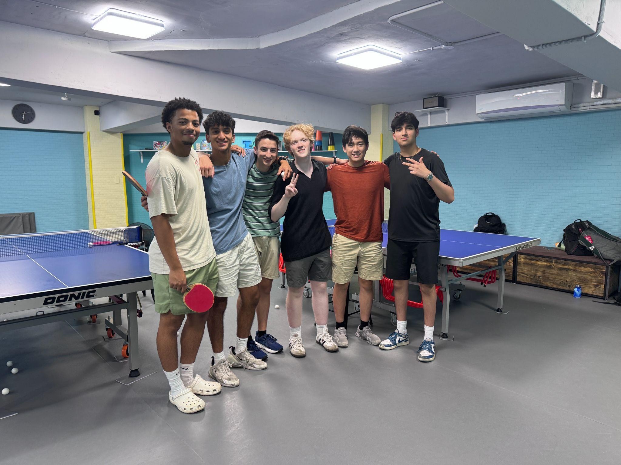 Sam, Idhaant, Valor, Preston and Chinmay playing ping pong.