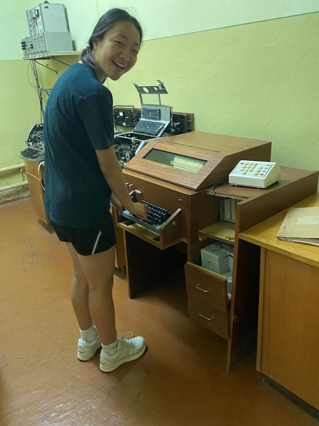 Ally, David, Andrea, Katie, and Beckett examine Soviet-era counting machines.