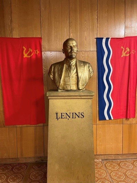 A bust of Lenin flanked by the flags of the Soviet Union and the Latvian Soviet Socialist Republic.