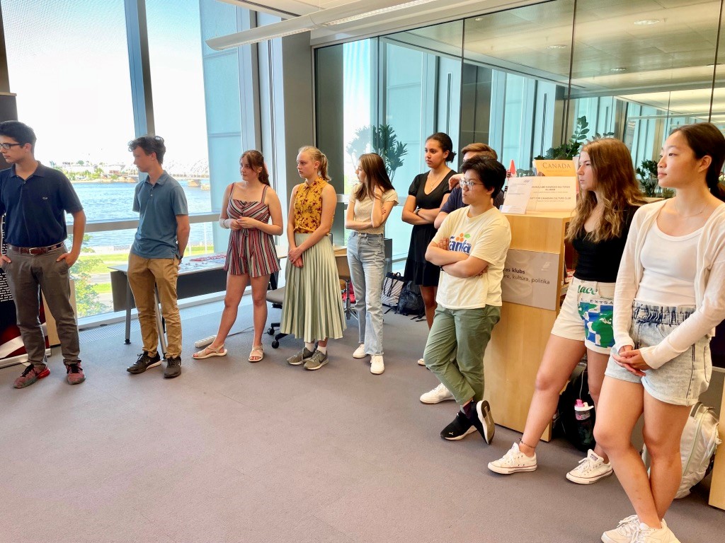 Thursday evening, several of our students met at the American Center in Riga with students from the Riga Young Leaders School, one of the partners of the American Embassy in Latvia. This event brought American and Latvian students together for an informal discussion about democracy and social media. In this photo, Alex, David, Jillian, Zoey, Chloe, Ally, Andrew, Helen, Katie, and Andrea listen to an introduction to the evening’s activities.